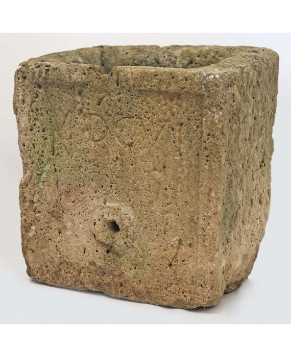 Vasca per fontana in travertino scolpito datata 1606. Italia, sec. XVII. cm41x40x33
