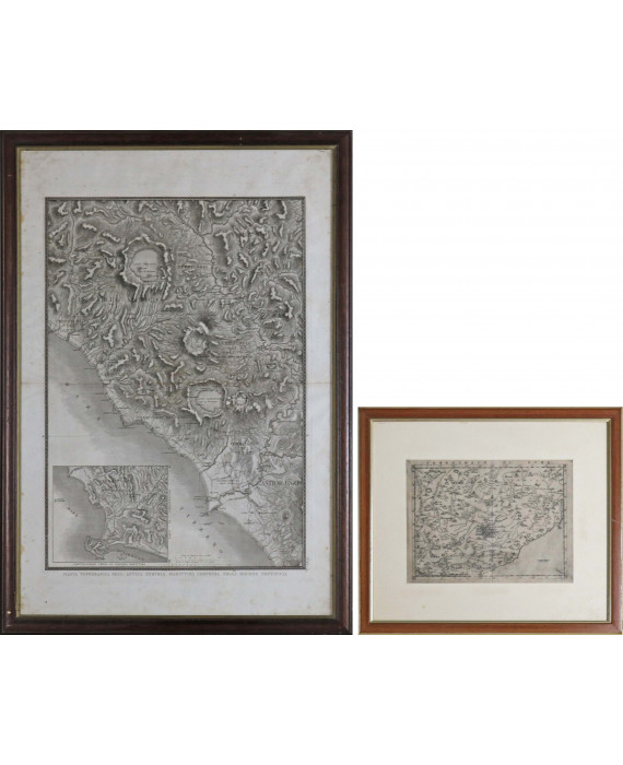 Lotto di due incisioni cartografiche: Girolamo Ruscelli (Viterbo 1518- Venezia 1566). Territorio di Roma, 1561 c.a. Mappa tratta da La Geografia di Claudio Tolomeo alessandrino, già tradotta di greco in italiano..., con cornice; Luigi Canina (1795-1856). Pianta topografica dell'Antica Etruria marittima compresa nella dizione Pontificia, timbro a secco dello Stato Pontificio in basso a sinistra, con cornice. cm28,5x22/74x50 (macchie)