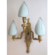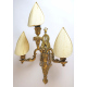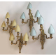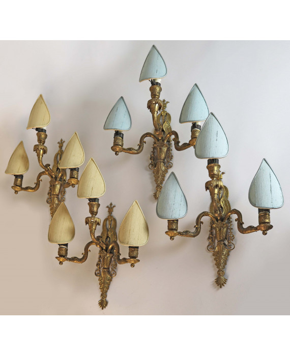 Serie di quattro applique a tre luci in bronzo dorato e lavorato con serti vegetali, fiori stilizzati, e teste di uccelli. Alt. cm37