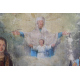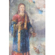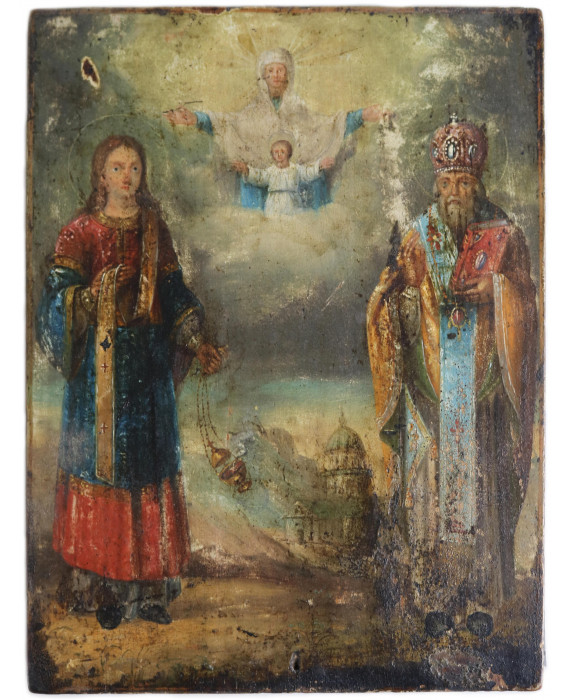 Icona russa del XIX secolo raffigurante Vergine con il Bambino e i Santi Romano il Melode (o Santo Stefano) e Nicola di Myra (?) e basilica sullo sfondo