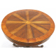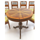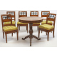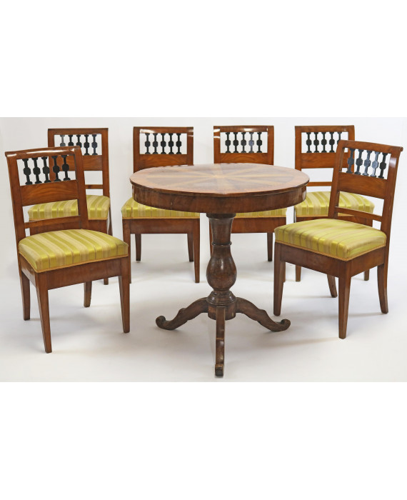 Lotto di un tavolo tondo in legno di ciliegio, con piano intarsiato in legni pregiati, fusto tornito centrale su base a tripode, ed un gruppo di sei sedie in legno di ciliegio con seduta rivestita in stoffa. Italia, sec. XIX