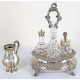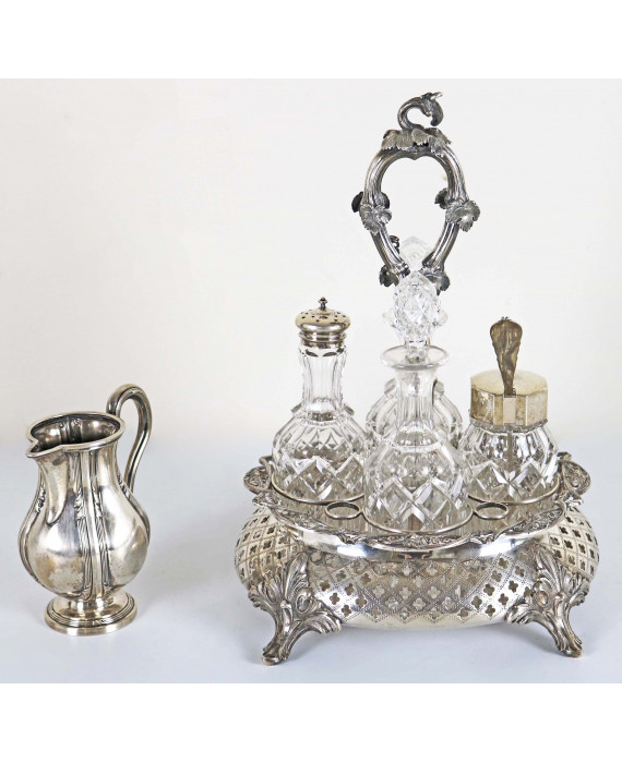 Lotto di una elegante oliera in argento con corpo traforato e lavorato con tralci d'uva, quattro peducci a voluta e quattro contenitori in vetro sfaccettato, firmata C. Becker ed una lattiera in argento 800. Peso tot. gr. 780