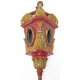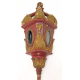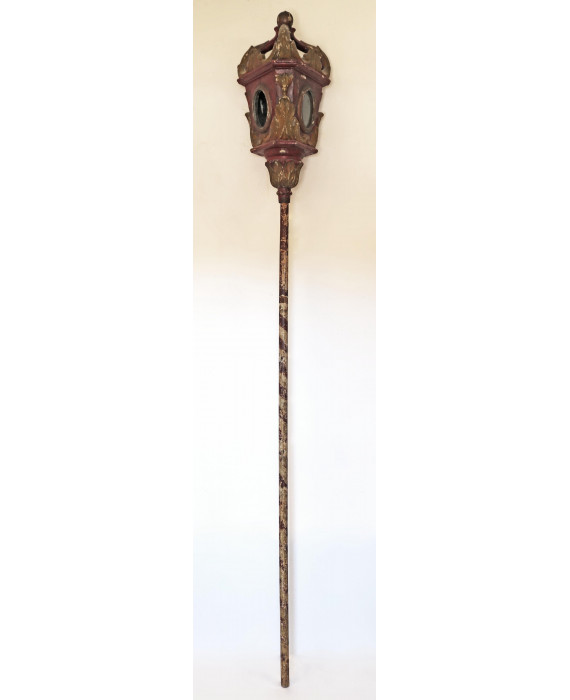 Lanterna processionale in legno laccato rosso, decorata in oro ed intagliata a foglie. Italia, inizi sec. XIX. Alt. cm265. (due vetri mancanti e mancanze alla doratura e laccatura)