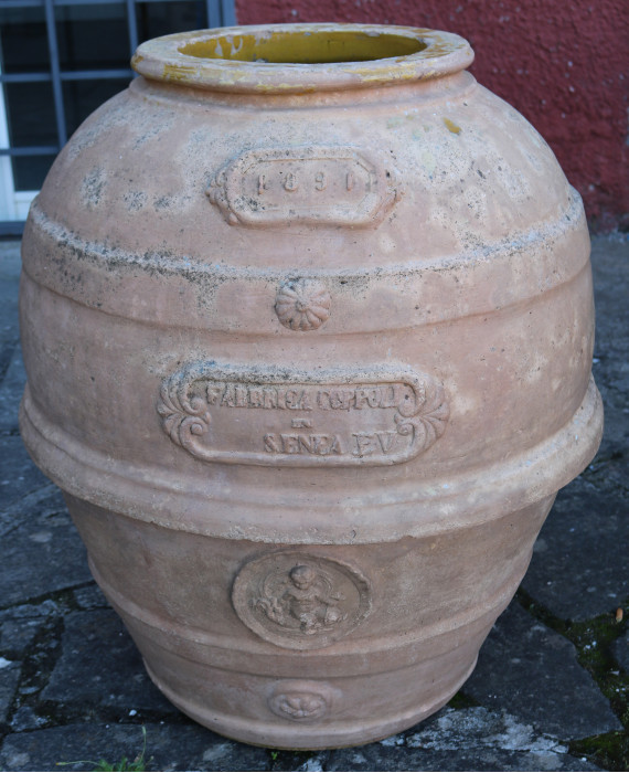 Orcio in terracotta con medaglione con putto su delfino, due cartigli con data 1891 ed iscrizione Fabbrica Coppoli S. Enea E.V.. Alt. cm80