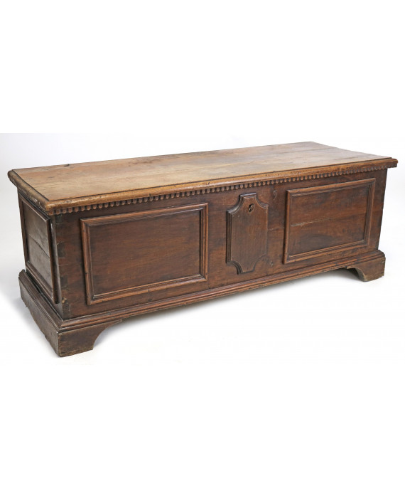 Cassapanca in legno di noce con fronte e laterali riquadrati. Italia, sec. XVII. cm56x154x56