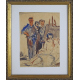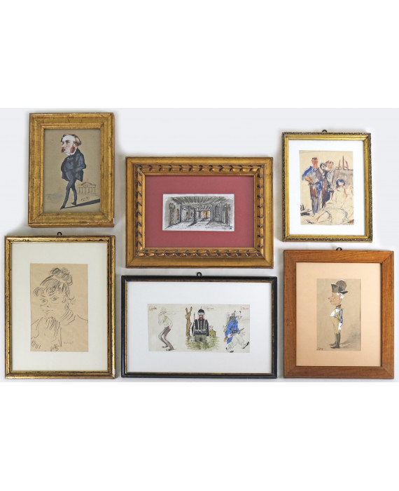 Lotto di sei disegni: Coutand Lucien (Francia, 1904). Studio di interno. Disegno a china e acquerello su carta, firma in basso a destra, con cornice12x21. Bona de Mandiargues (Roma 1926 - Parigi 2000). Studio di volto, Parigi, '81. Disegno a matita su carta, firma, data e luogo in basso a destra, con cornice. cm26,5x17,5. Lerius, sec. XX. Studio di pittori. Disegno e acquarello su carta, firma in basso a destra, con cornice. Aurili, sec. XIX/XX. Sterlin, 1858. Disegno a tempera ed acquarello, firma, data e titolo in basso a destra, con cornice. cm26x17. Artista del sec. XIX/XX. Studio di militari: L'Anglais; Le Prussien; l'Italien. Acquarello su carta, titoli in alto con cornice. cm15x30. Sem pseudonimo di Georges Goursat (1863-1934). Caricatura. Disegno a tempera e acquarello su carta, firma in basso a sinistra, con cornice. cm22x13