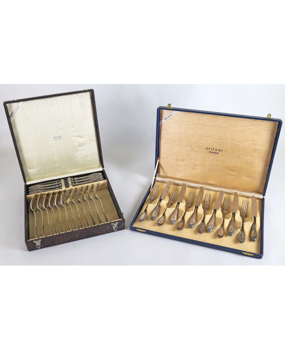 Servizio di posate in argento 800 composto da sei forchette, sei cucchiai, sei coltelli e sei forchette e sei coltelli medi. Peso tot. esclusi coltelli gr. 1280