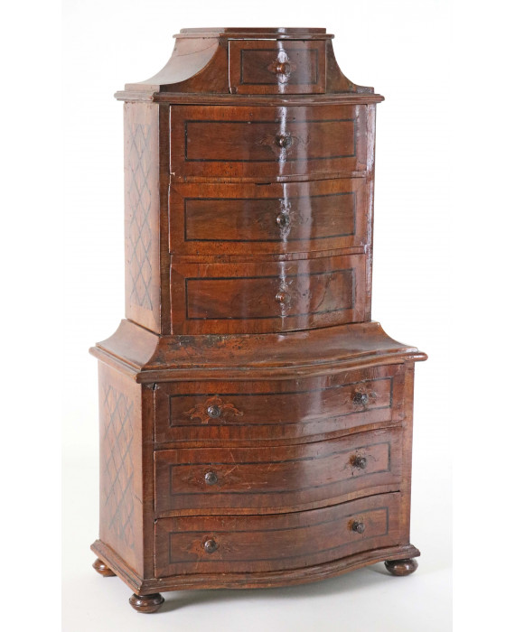 Modellino di mobile a due corpi in legno di noce, filettato in legno ebanizzato, quattro cassetti superiori, tre cassetti inferiori, fronte mosso. Italia, sec. XIX. Cm. 60x33x18 (mancanza laterale)