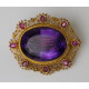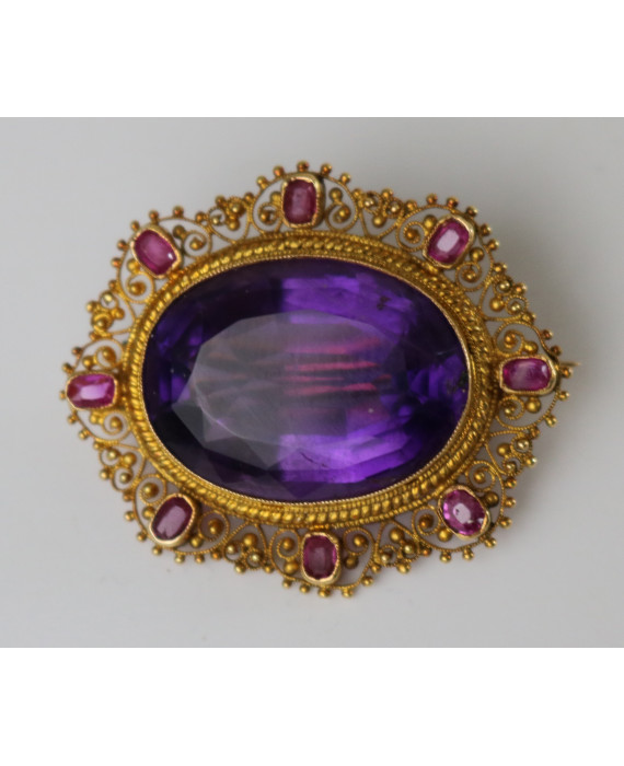 Spilla in oro giallo 18Kt con ametista di circa 16 carati. Peso tot. 7,9. Allegata dichiarazione di autenticità a cura della gioielleria Ci & Ci