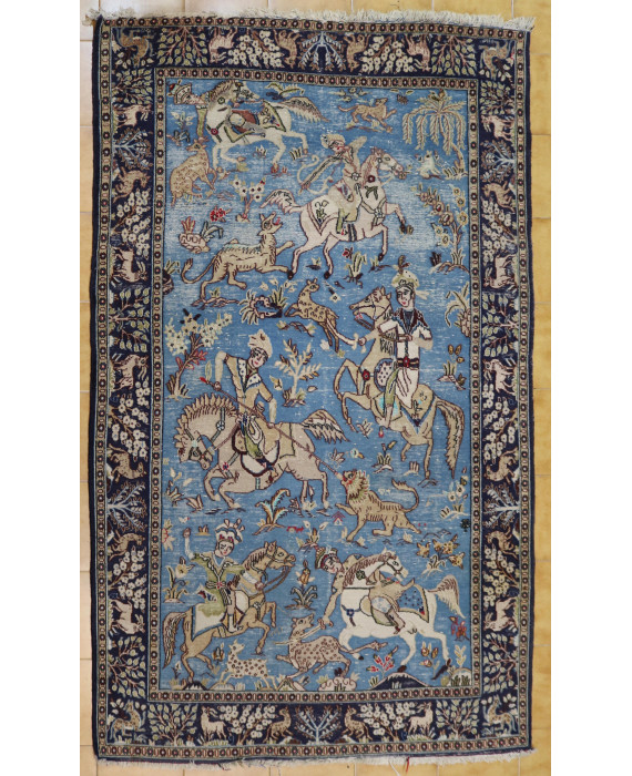 Tappeto Qum decorato a motivi di scene di caccia con il leone. cm255x155 (usure)