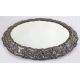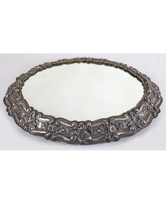 Elegante vassoio in argento lavorato con serti floreali e volute vegetali, con fondo a specchio. Anni '30. Peso dell'argento gr. 1080. cm54x40