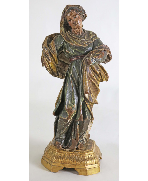 Scultura in legno intagliato e dipinto raffigurante Madonna, occhi in vetro, base in legno dorato e decorato a palmette. Napoli, sec. XVIII. Alt. cm33 (difetti e mancanze)