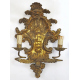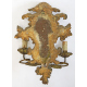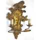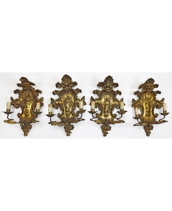 Serie di quattro applique a due fiamme in legno dorato, intagliato a volute vegetali e fiori. Italia, sec. XVIII. cm38x25