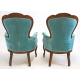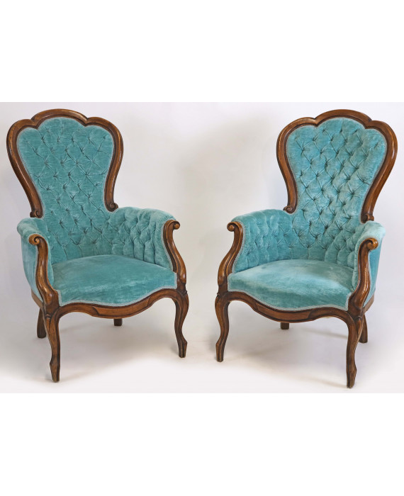 Coppia di poltrone in legno di noce, rivestite in velluto turchese. Italia, sec. XIX.