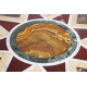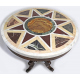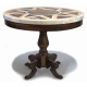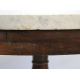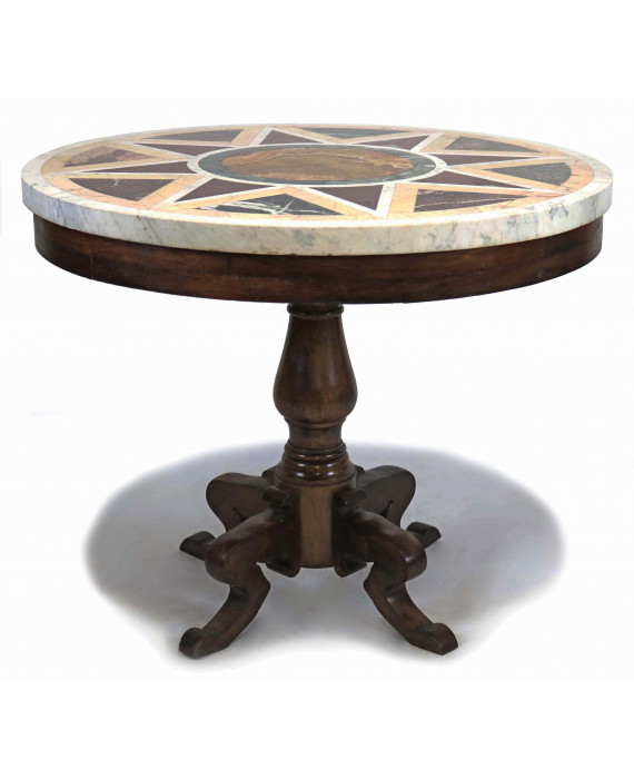 Tavolo con piano tondo in marmo bianco lastronato in policromia con marmi pregiati, base in legno di noce con fusto centrale terminante su quattro sostegni a voluta. Alt. cm82; diam. cm100