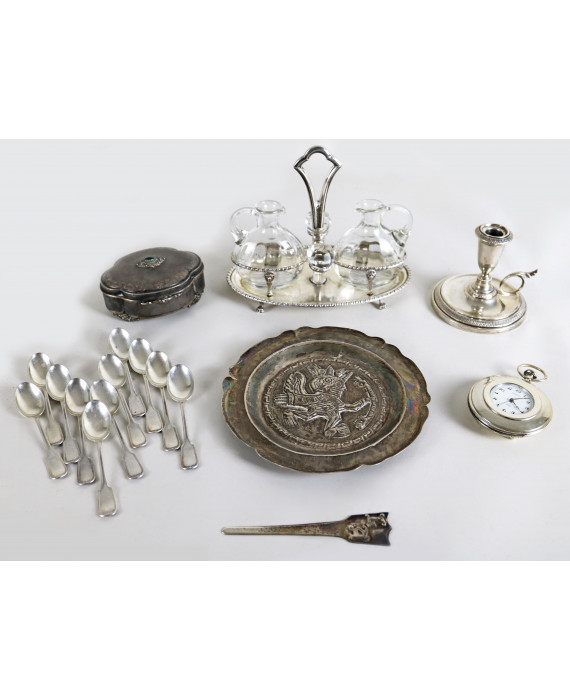 Lotto di vari oggetti in argento, tra cui un piattino di manifattura peruviana in argento 925, un'oliera completa di ampolle in vetro, una scatola portagioie ed una bugia. Peso tot. argento 800 gr. 995; peso piattino in argento 925 gr. 165 (lievi ammaccature)