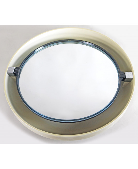 Specchiera tonda da parete di marca Allibert mod. Wand-Leuchtspiegel A 41 in materiale plastico con specchio basculante e quattro luci interne. Diam. cm61 (usure del tempo)