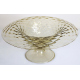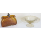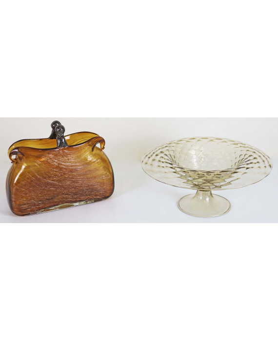 Lotto di un centrotavola ed un vaso a forma di borsetta in vetro di Murano nei toni dell'ambra. Alt. cm13/19