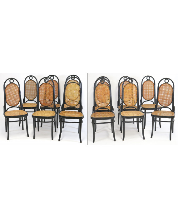 Gruppo di dodici sedie in legno ebanizzato con seduta e spalliera in paglia di Vienna (mancanza ad una, restauri e difetti alla paglia di una)