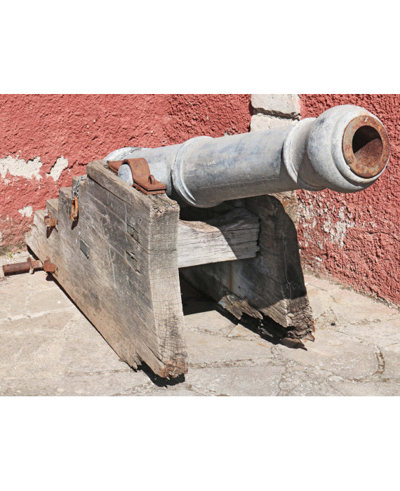 Replica di bombarda in metallo, con basamento in legno. Lungh. cm153 (difetti e mancanze)