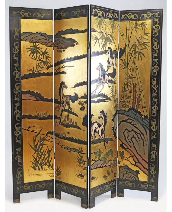Paravento coromandel a quattro ante in lacca nera a fondo oro, decorata a rilievo con paesaggio lacustre, bambù, cavalli in corsa, uccelli e fiori. Cina, inizi sec. XX. cm183x40(anta) (abrasioni)