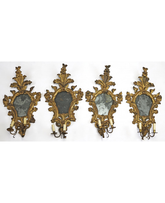 Serie di quattro specchiere a due fiamme in legno dorato intagliate a volute rocaille e fiori. Italia, sec. XVIII. cm70x40 (difetti)