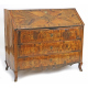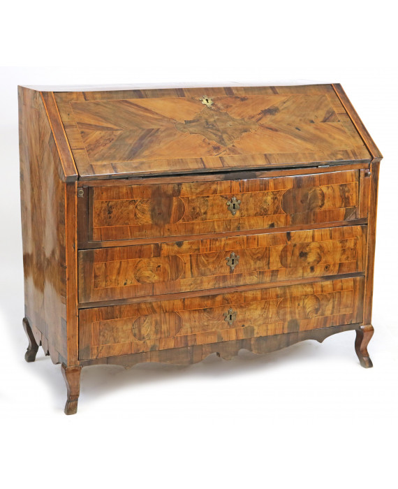 Ribalta lastronata in legno di ciliegio e filettata in legni chiari, calatoia con all'interno quattro cassettini e vano centrale, tre cassetti inferiori, gambe mosse. Italia, sec. XVIII. cm104x117x58 (difetti alla lastronatura)