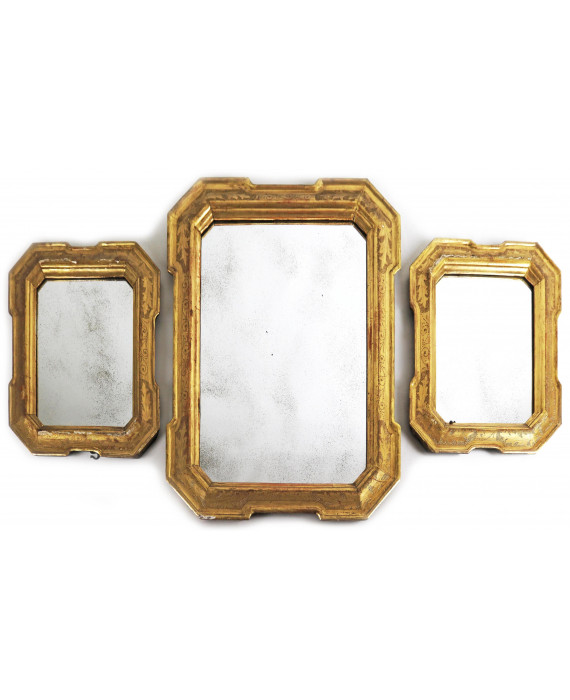 Set composto da una specchiera ed una coppia di specchierine in legno dorato ed inciso a volute e serti vegetali. Italia, fine sec. XIX. cm67x52/42x36(2) (piccole mancanze alla doratura)