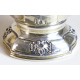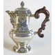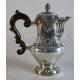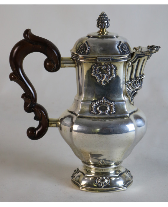 Elegante caffettiera in argento a corpo costolato e lavorato a volute rocaille e conchiglie, pomolo a pigna, interno in vermeille, manico in legno. Alt. cm26. Peso tot. gr. 710 (bolli non identificati)