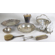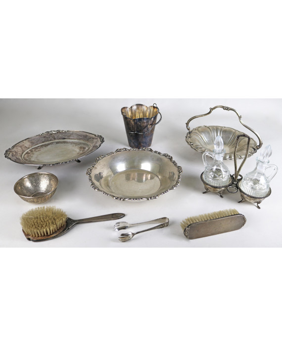 Lotto di otto oggetti in argento 800: un portaghiaccio, un'oliera completa di ampolle in vetro, un cestino, tre centrotavola e due spazzole. Peso tot. dell'argento, escluse spazzole, gr. 1855 (difetti e mancanze)