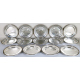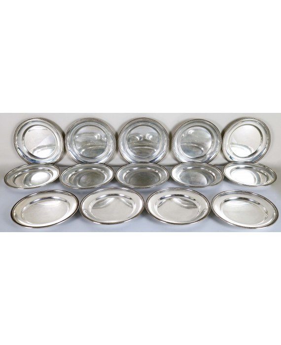 Servizio di 14 piattini in argento 800 con bordo decorato a palmette. Diam. cm20. Peso tot. gr. 3400
