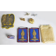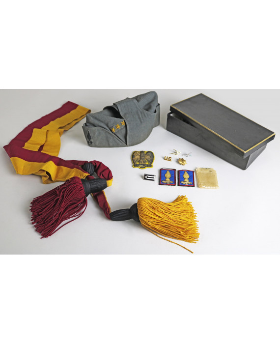 Lotto di una sciarpa Littorio, completa di scatola originale, conferita come onorificenza a chi aveva partecipato alla marcia su Roma o chi era stato per almeno 10 anni ufficiale della Milizia del PNF, una bustina da colonnello della Seconda Guerra Mondiale e alcune mostrine e spille (lievi difetti)