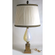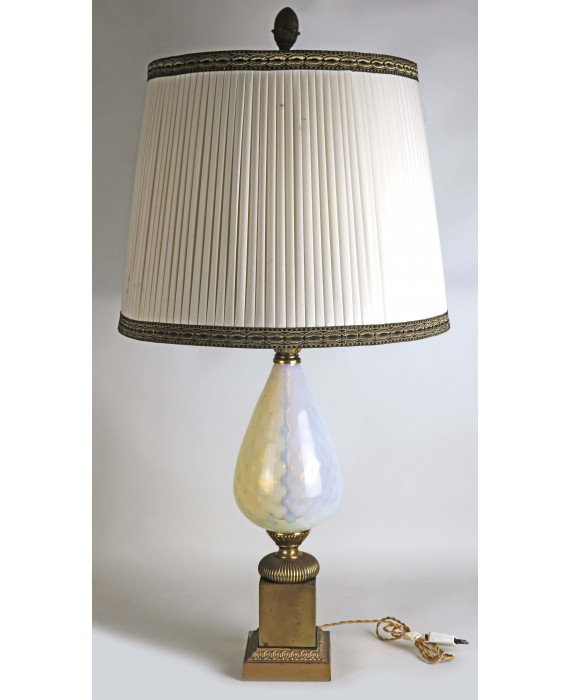 Lampada da tavolo con struttura in bronzo e corpo in vetro con inclusioni dorate, completo di paralume in stoffa. Alt. cm100