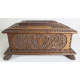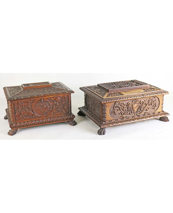 Lotto di due scrigni in legno di noce intagliato a grottesche, girali floreali e stemmi araldici, peducci a zampa ferina. Italia, sec. XX. cm20x44x32/20x36x30