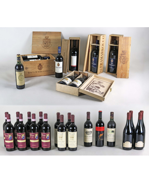 Lotto di varie bottiglie di vino da collezione: un magnum di Brunello di Montalcino Civitas del 2000, due magnum di Nero di Serramarrocco del 2009, otto bottiglie di Brunello di Montalcino Fattoria Poggio di Sotto del produttore E. & G. Palmucci del 1998, quattro di Montepulciano d'Abruzzo dell'Azienda Agricola Masciarelli del 1997, sei della Tenuta Serramarrocco del 2004, quattro di Montepulciano S. Martino Rosso Marina Cvetic del 1997, una di Cabernet Sauvignon Yellow Tail del 2003, una di Cordier Chateau Gruaud Larose del 1983, una di Médoc Chateau Patache d'Aux del 1996, una di Saint Emilion Grand Cru Chateau Bellefont-Belcier del 1993 e due di Chateauneuf-du-Pape del 1992 (difetti)