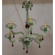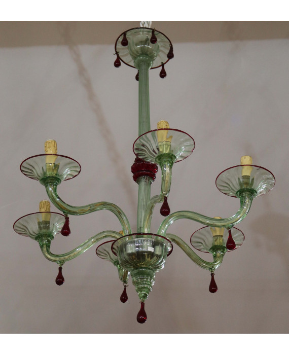 Lampadario a sei luci in vetro di Murano a fondo verde, con rifiniture in vetro rosso