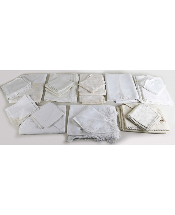 Lotto di otto tovaglie in tessuto ricamato, complete di tovaglioli (difetti ed una tovaglia senza tovaglioli)