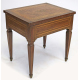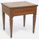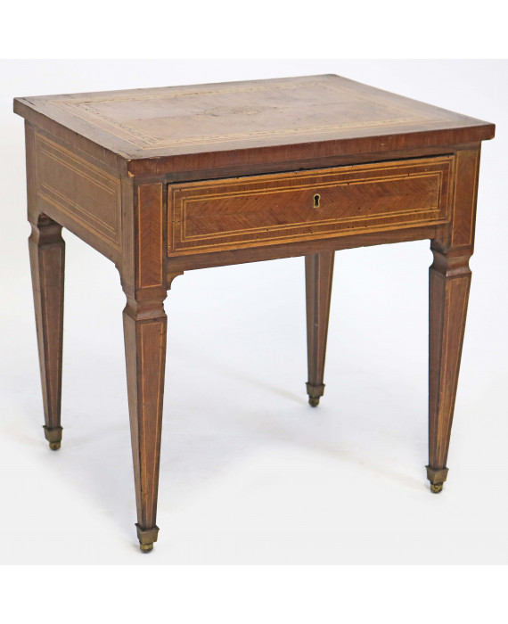Tavolinetto impiallacciato in legno di noce con filettature ed intarsi in legni chiari, un cassetto, quattro gambe piramidali. cm58x56x45 (difetti)