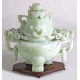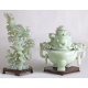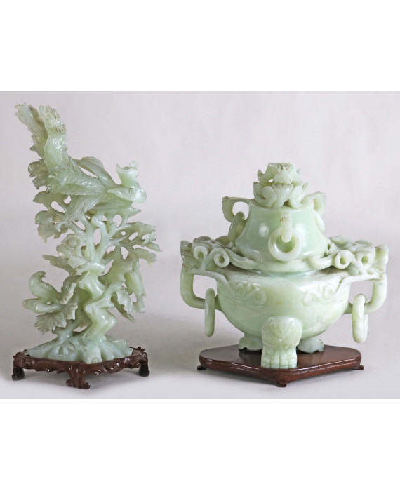 Lotto di due oggetti in giada verde su basi in legno: un incensiere lavorato con cani Pho, volute ed anelli ed una scultura in giada verde raffigurante ramo fiorito con uccelli. Cina, sec. XX. Alt. cm24/29 (lievi difetti)