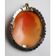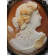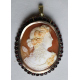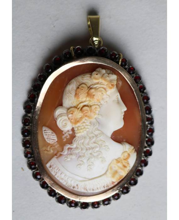 Pendente in oro giallo 12Kt ed argento con granati di circa 1,20 carati e cammeo in conchiglia con profilo di gentildonna. Peso tot. gr. 16,7. Allegata dichiarazione di autenticità a cura della gioielleria Ci&Ci