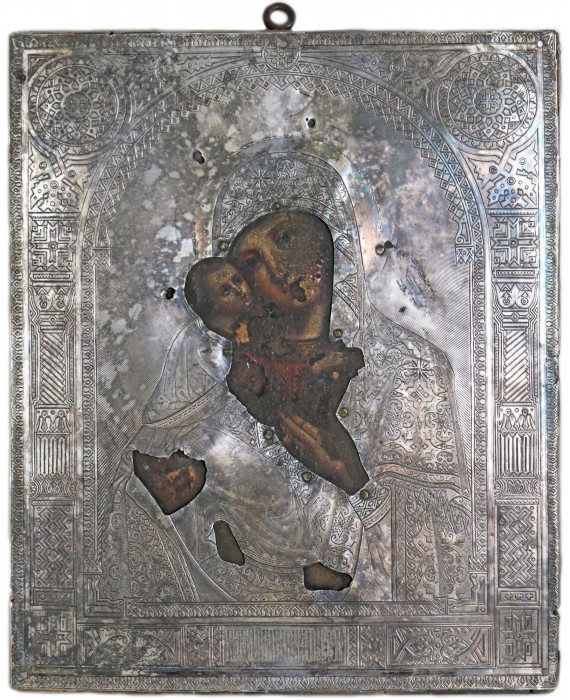 Icona dipinta su tavola raffigurante Madonna con Bambino, con riza in argento inciso. Russia, inizi sec. XIX (mancanze e difetti)