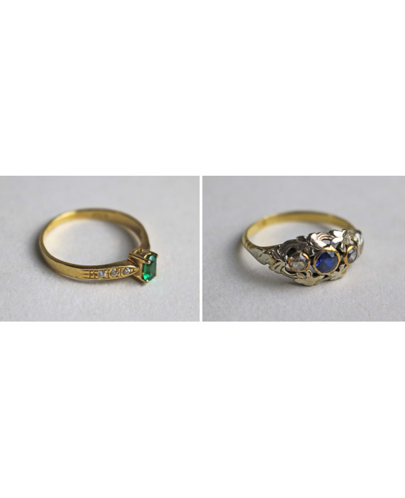 Lotto di due anelli: uno oro giallo e bianco 18Kt con zaffiro di circa 0,25 carati e due brillanti di circa 0,10 carati ed uno in oro giallo 18Kt con smeraldo di circa 0,23 carati e sei brillanti di circa 0,10 carati. Misura 11. Peso tot. gr 3,6