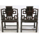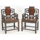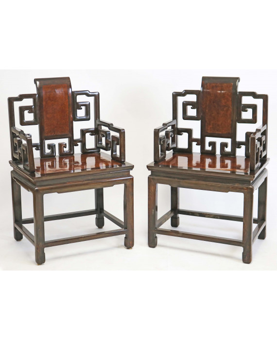Coppia di eleganti poltrone in legno esotico con seduta e spalliera in radica. Cina, periodo Dinastia Qing, fine sec. XIX/XX