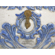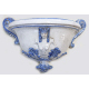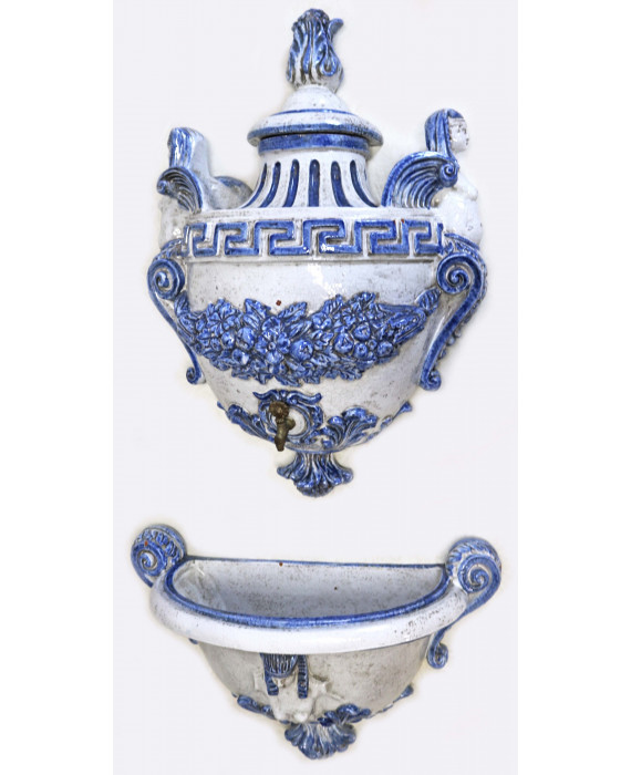 Grande fontana da parete, completa di catino, in terracotta bianca ed azzurra smaltata, lavorata con serti di frutta, volute e sfingi alate, firmata Fratelli Ceccarelli. cm83x56x27 (fontana); cm40x67x27 (catino)