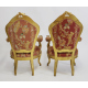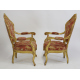 Coppia di poltrone in legno dorato ed intagliato a volute vegetali, braccioli a ricciolo, gambe mosse, sedute e spalliere rivestite in stoffa. Italia, sec. XIX (restauri e piccole mancanze alla doratura)