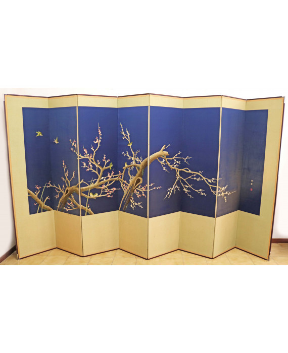 Grande paravento ad otto ante in tessuto ricamato con rami fioriti ed uccelli con la tecnica del forbidden knot. Manifattura orientale, sec. XX. Alt. cm205; largh. anta cm50 (lievi difetti)