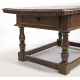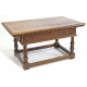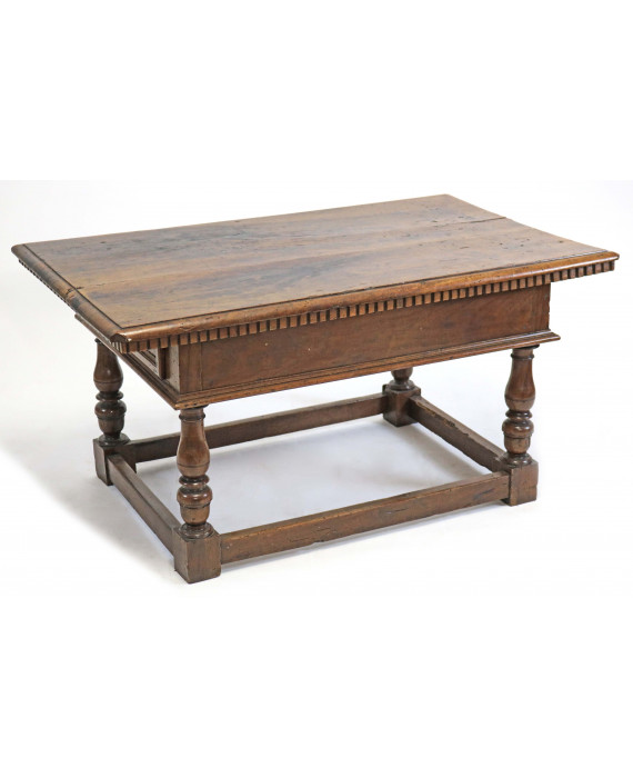 Tavolo rettangolare in legno di noce, due cassetti laterali, quattro supporti torniti raccordati da traverse. Italia centrale, sec. XVII. cm58x117x70 (restauri)