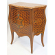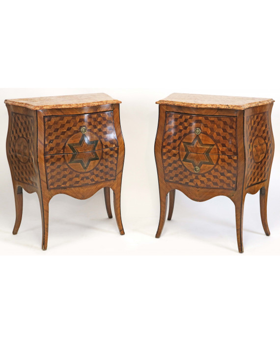 Coppia di comodini impiallacciati in legno di noce ed interamente intarsiati a marqueterie con intarsi a stella, due cassetti, fronte e laterali mossi, piani in marmo. cm86x68x43 (piccole mancanze)