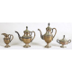 Servizio da tè e caffè in argento 800 a corpo liscio con bordi decorati a palmette e pomoli a pigna, composto da teiera, caffettiera, lattiera e zuccheriera. Peso tot. gr. 735