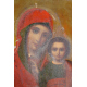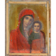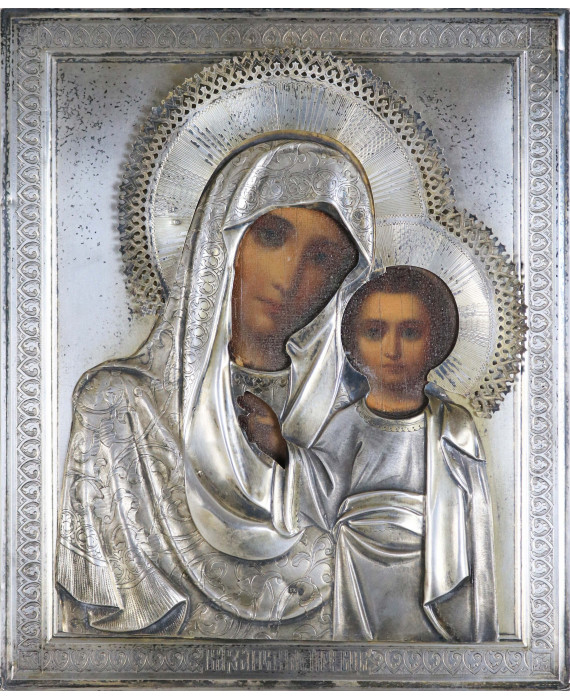 Icona dipinta su tavola raffigurante Madonna con Bambino, con riza in argento, bolli Russia, sec. XIX. cm27x22